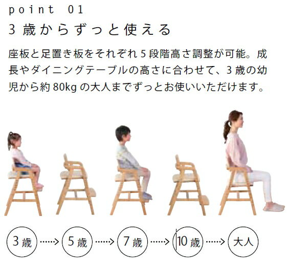 成長に合わせて、座板の高さや奥行き、足置き板の高さを調節できるので、子どもから大人まで長く使うことができます。