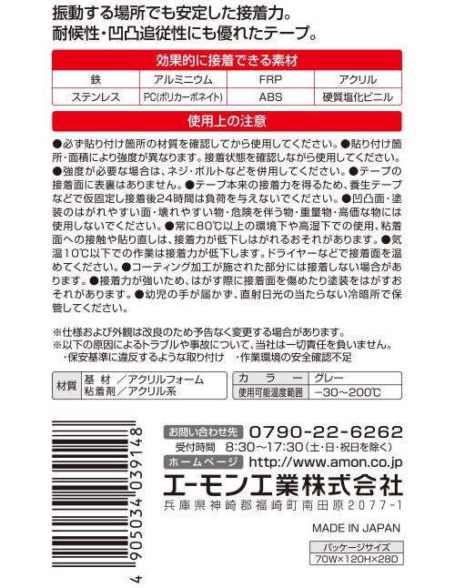エーモン【3914】超強力両面テープ 商品説明 ■ミラーカバー・エアロアンテナなどの取り付けに ■すぐ付く ■低温接着性が良い ■凹凸追従性が良い ■振動吸収性が良い 【仕様】 ・サイズ:幅25mm×長さ2m 厚さ1mm ・カラー:グレー ・使用温度範囲:-30〜200℃ ・材質:基材/アクリルフォーム 粘着剤/アクリル系 【効果的に接着できる素材】 鉄・アルミニウム・FRP・アクリル・ステンレス・ PC(ポリカーボネイト)・ABS・硬質塩化ビニル 【内容物】 ・超強力両面テープ:1巻 製品コード3914 製品名超強力両面テープ JANコード4905034039148 ※掲載商品の仕様、デザイン、生産国、発売時期は 予告なく 変更する場合がありますので、 あらかじめご了承ください。