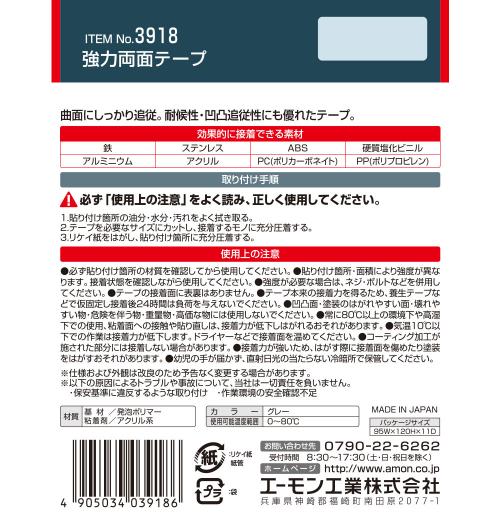エーモン【3918】強力両面テープ 商品説明 ■リップスポイラー・バイザーなどの取り付けに ■低温接着性が良い ■耐候性が高い ■振動吸収性が高い ■JIS Z1541 1種1号適合 【仕様】 ・サイズ:幅10mm×長さ3m 厚さ0.85mm ・使用温度範囲:-20〜200℃ ・カラー:グレー ・材質:基材/発泡ポリマー 粘着剤/アクリル系 【効果的に接着できる素材】 鉄・ステンレス・ABS・硬質塩化ビニル・アルミニウム・ アクリル・PC(ポリカーボネイト)・PP(ポリプロピレン) 【内容物】 ・強力両面テープ:1巻 製品コード3918 製品名強力両面テープ JANコード4905034039186 ※掲載商品の仕様、デザイン、生産国、発売時期は 予告なく 変更する場合がありますので、 あらかじめご了承ください。